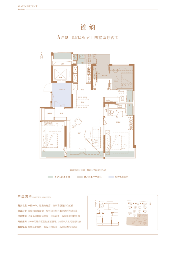 143㎡大平层四房是项目的高端户型,专为改善型大家庭、追求高品质生活的精英人群打造,以 “阔绰空间、全景视野、豪华配置” 为核心亮点。户型采用横厅设计,客厅面宽达到 5.2 米,进深仅 3.8 米,搭配 270° 全景落地窗,将室外景观尽收眼底,营造出堪比别墅的居住体验。客厅与餐厅一体化设计,总面积约 30㎡,空间开阔,能够轻松容纳 10 人以上的家庭聚会或朋友宴请,彰显主人的品味与身份。