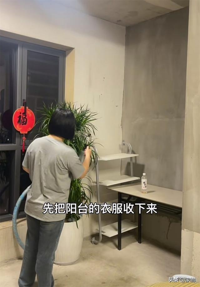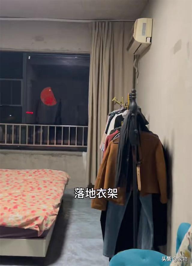 哦对了,与客厅相连的阳台自然也没有做推拉门,只是在一边安装晾衣架,另一边放简易桌做叠衣区,平日里洗完衣服在这里晾晒非常合适,毛坯房虽简陋,白天的阳光和通风能力却都非常不错。